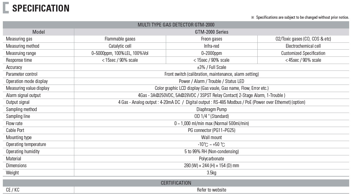 - Detect Freon, Flammable, Oxygen & Toxic gases simultaneously - Apply algorithm to prevent malfunction for interference gas (PA, Ethanol, FC3283 and Alcohol types) - Fast response of gas leakage with a high efficient pump inside - Detection gas from low to high concentration owing to various detection principle - Stable quality and proved detection principle for service life - Built in Data & Event Logging - Parameter setting with Color graphic LCD - Self diagnosis function - Flow Sensor to control flow rate automatically - 2-stage alarm, 1-trouble display and relay contact output 4-20mA output signal - Easy configuration of monitoring by RS-485 Modbus (Isolated) and PoE communication(option) - Calibration and maintenance by one-man